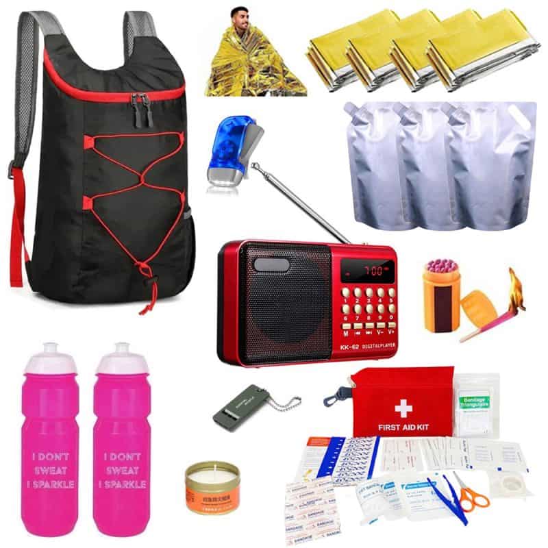 - Inhoud: Rugzak, noodradio, EHBO-kit, 4x warmtedeken, noodkaars, knijpkat, lucifers, 3x waterzak, 2x drinkfles, noodfluit